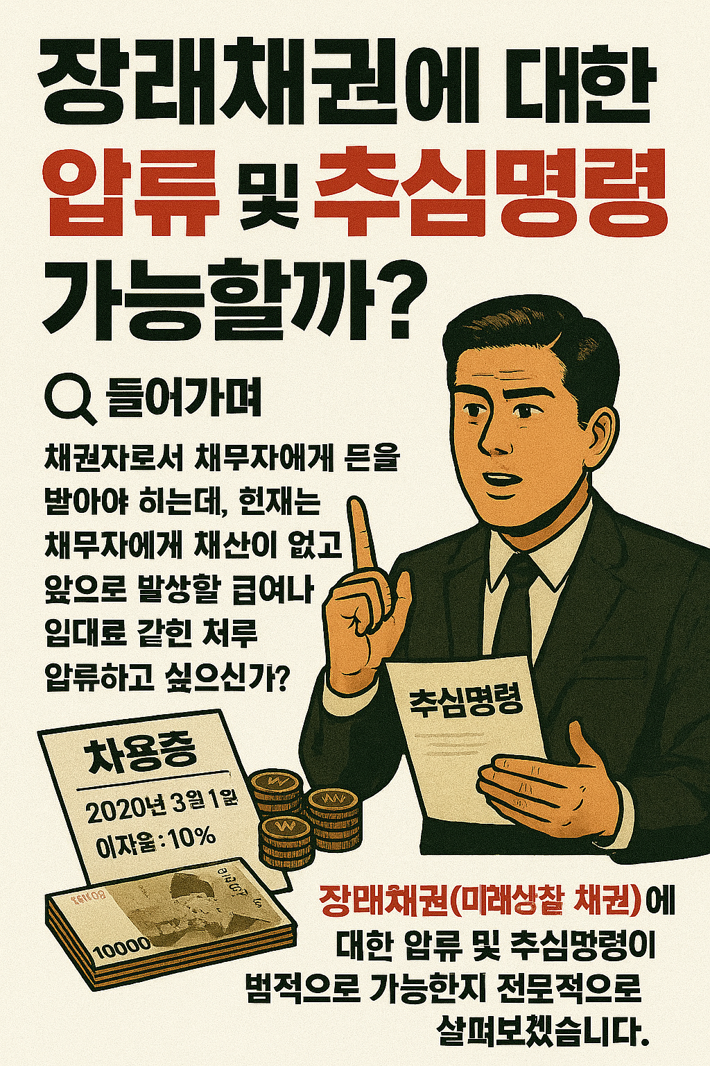 채권자로서 채무자에게 돈을 받아야 하는데, 현재는 채무자에게 재산이 없고 앞으로 발생할 급여나 임대료 같은 채권을 압류하고 싶으신가요? 오늘은 **장래채권(미래에 발생할 채권)**에 대한 압류 및 추심명령이 법적으로 가능한지 전문적으로 살펴보겠습니다.